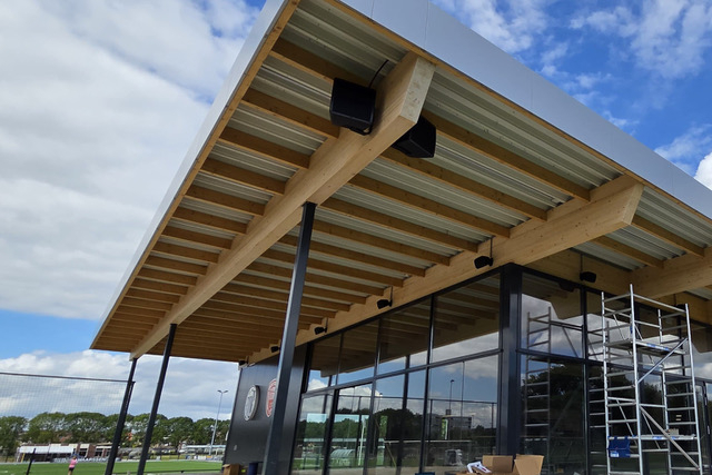 Met in totaal tien buitenluidsprekers is er ruime dekking én voldoende headroom. De bekabeling is volledig strak en esthetisch weggewerkt zodat het ontwerp van het clubgebouw intact blijft.